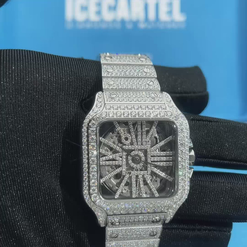 This moissanite watch is iced out with round, colorless (D-Color), VVS moissanite flawless diamonds. All of the diamonds on this skeleton watch are guaranteed to pass the diamond tester.