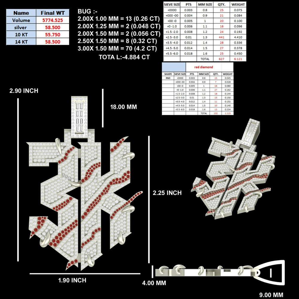 This pendant weighs 49 grams and has a total diamond carat weight of 9.60 CTW however, the exact weight will vary depending on the Size of your pendant. The bail of this custom design moissanite pendant measures 13mm, however, we can make the bail any size you want.