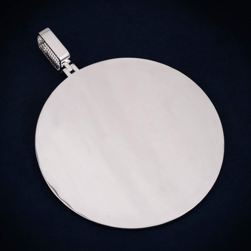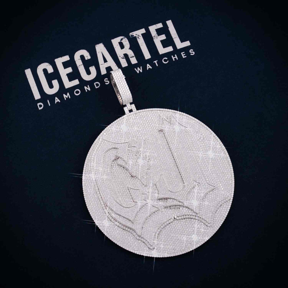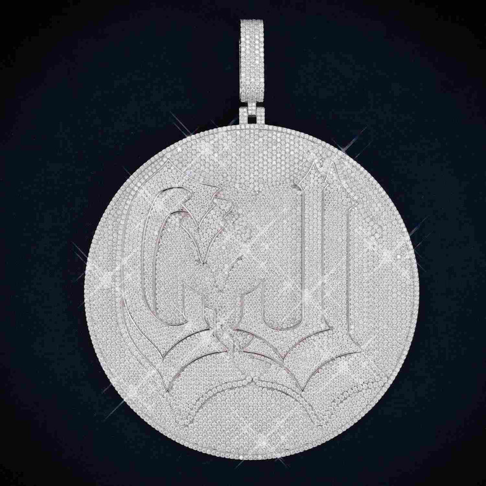 The total weight of this customized pendant starts from 108.5 grams (4 letters), however, the exact weight will vary depending on the Size. The bezel of this custom design moissanite pendant measures approximately