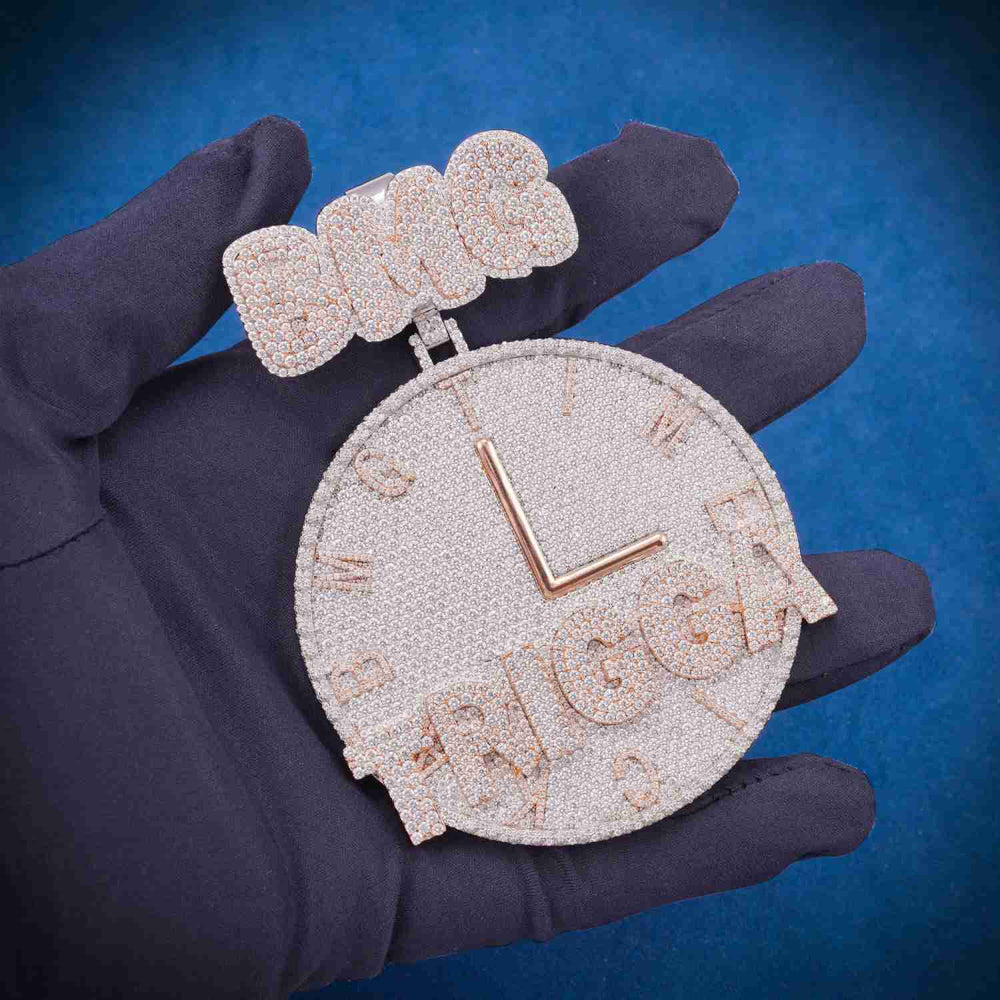 The total weight of this customized pendant starts from 108.5 grams (4 letters), however, the exact weight will vary depending on the Size. The bezel of this custom design moissanite pendant measures approximately
