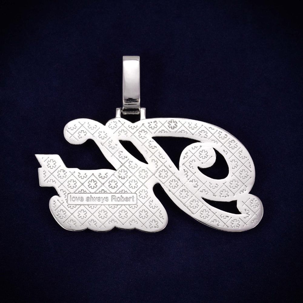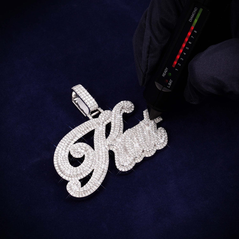 This moissanite custom name pendant is iced out with moissaniteย cut, colorless (D-Color), VVS moissanite flawless diamonds, placed in a prong diamond setting. All of the diamonds on this custom moissanite name pendant are guaranteed to pass the diamond tester.