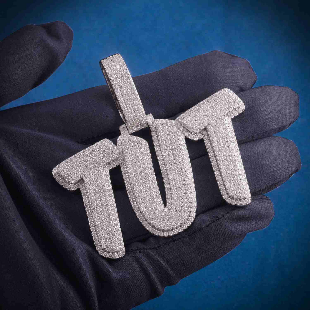 This moissanite custom name pendant is iced out with moissaniteย cut, colorless (D-Color), VVS moissanite flawless diamonds, placed in a prong diamond setting. All of the diamonds on this custom moissanite letter pendant are guaranteed to pass the diamond tester.