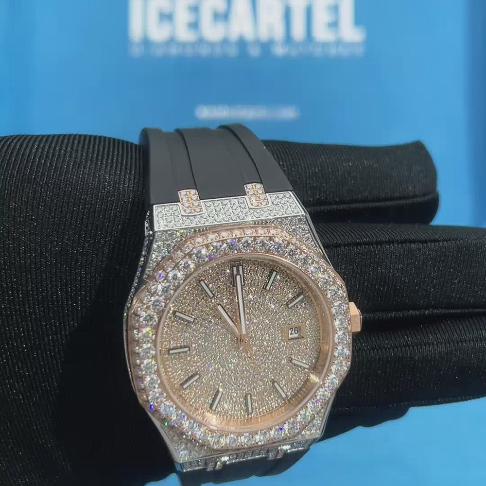 ICECARTEL exclusive Moissanite Iced Out Silicone Band Watchย is now available, made of stainless steel and PVD plated with a thick layer of 14K Rose Gold.