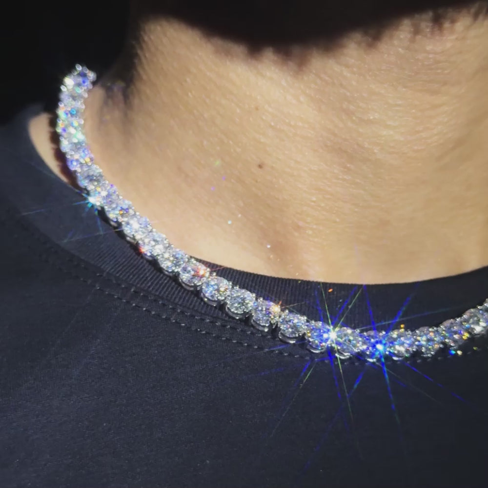 This moissanite tennis chain is iced out with round cut, colorless (D-Color), VVS moissanite flawless diamonds, placed in a prong diamond setting. All of the diamonds on this moissanite tennis chain are guaranteed to pass the diamond tester.