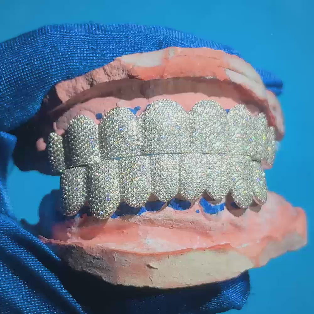 These 8 on 8 moissanite grillzย are iced out with round cut, colorless (D-Color), VVS moissanite flawless diamonds. All of the diamonds onย these moissanite grillz pass the diamond tester.ย