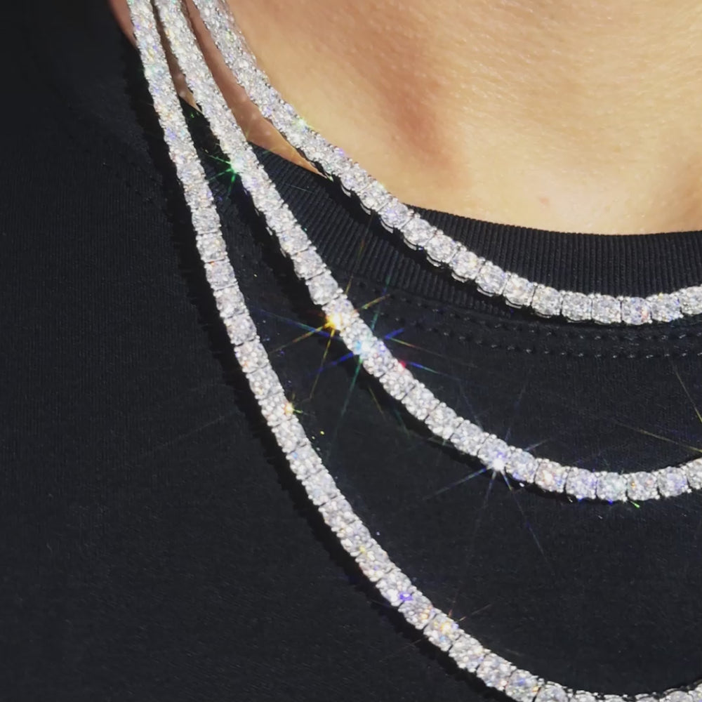 This moissanite tennis chain is iced out with round cut, colorless (D-Color), VVS moissanite flawless diamonds, placed in a prong diamond setting. All of the diamonds on this moissanite tennis chain are guaranteed to pass the diamond tester.