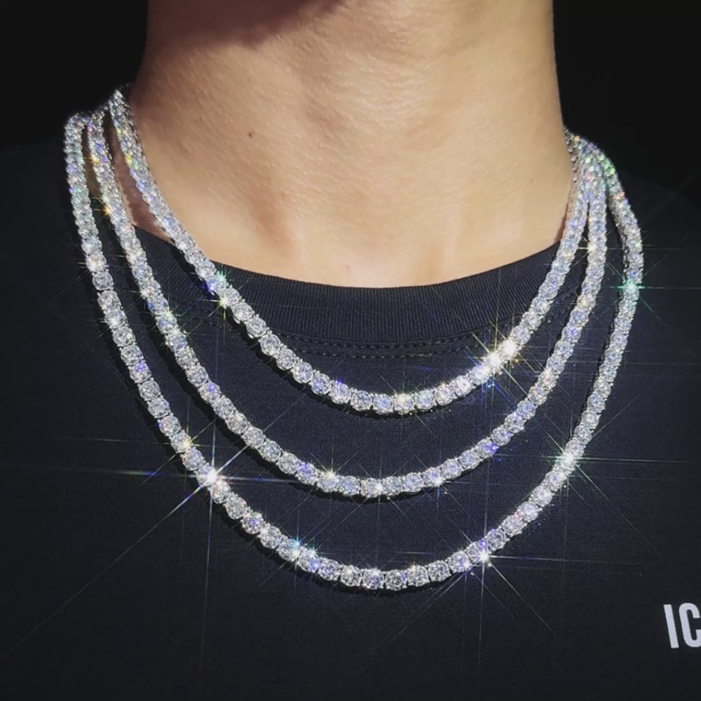 This moissanite tennis chain is iced out with round cut, colorless (D-Color), VVS moissanite flawless diamonds, placed in a prong diamond setting. All of the diamonds on this moissanite tennis chain are guaranteed to pass the diamond tester.