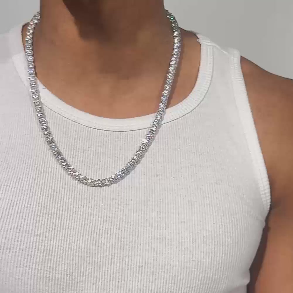This tennis chain is iced out withย round cut VVS diamond simulants (CZ).ย