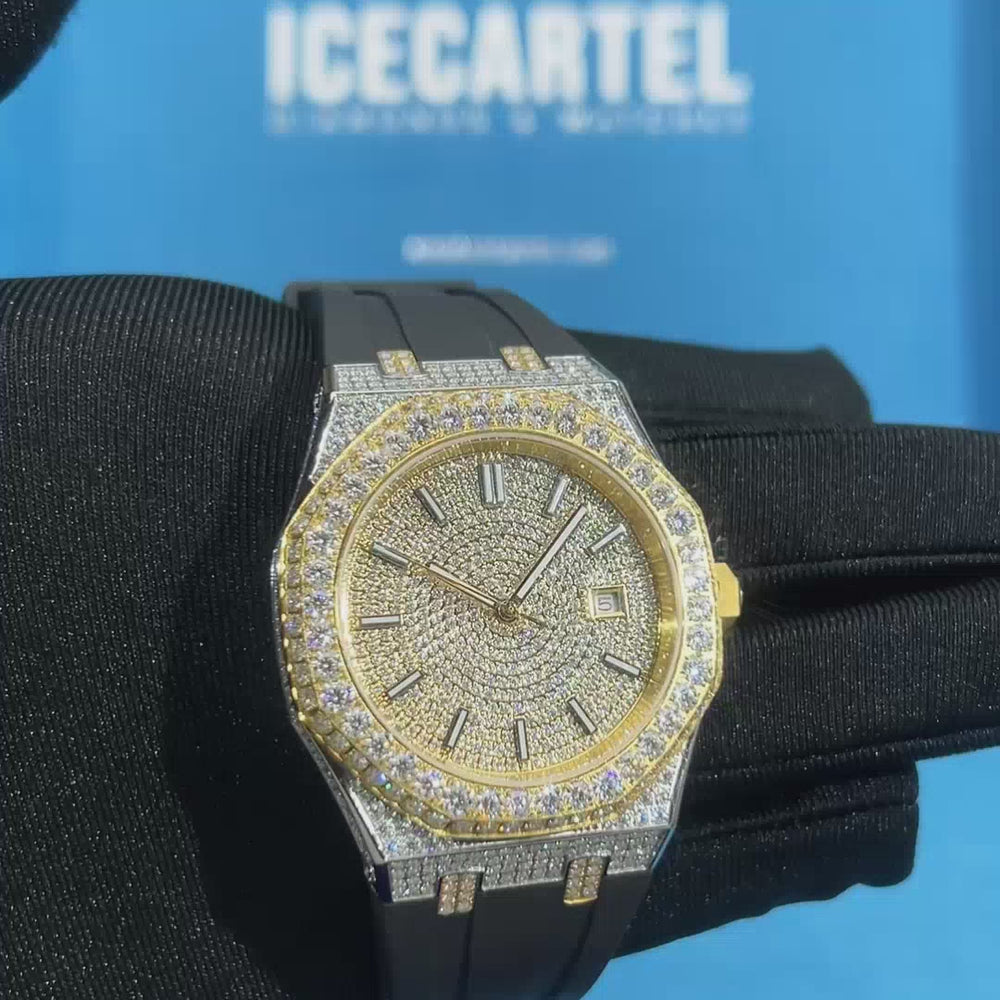 ICECARTEL exclusive Moissanite Iced Out Silicone Band Watchย is now available, made of stainless steel and PVD plated with a thick layer of 14K Yellow Gold.