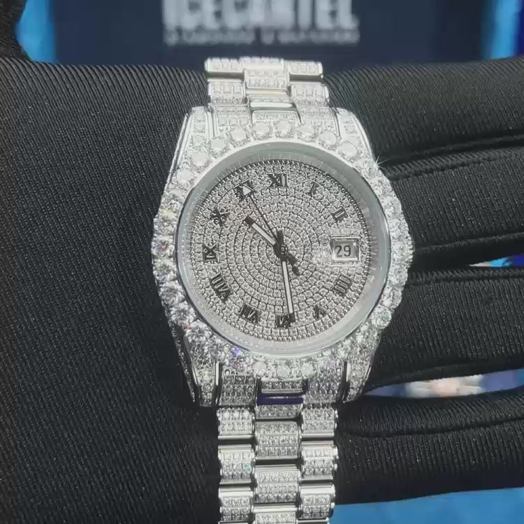 • Package Includes: ICECARTEL Custom Jewelry Box, Official GRA Moissanite Certficate, Moissanite Presidential Watch | 41MM | Roman Numeral Dial | 18.3CT Iced Out | 14K White Gold