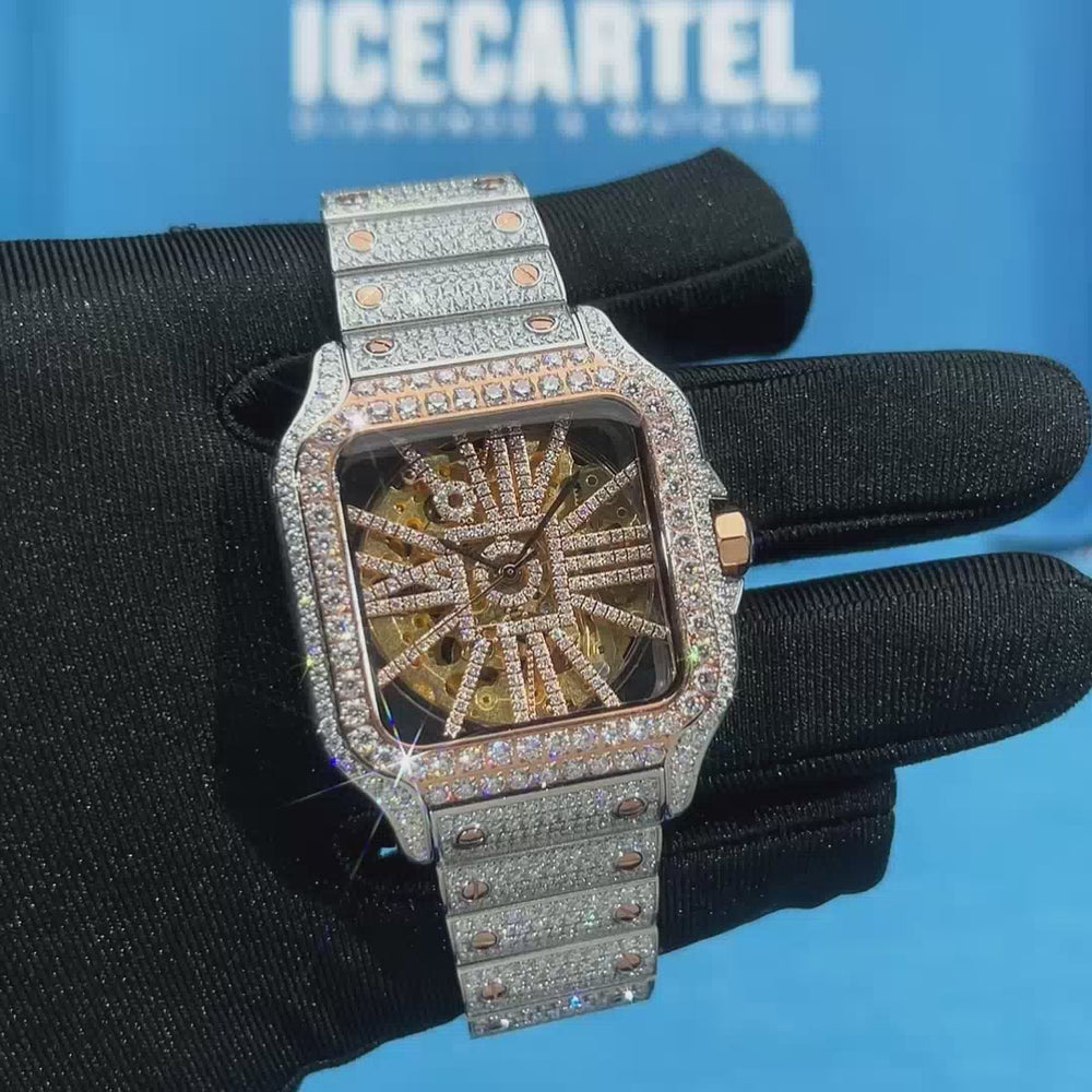 ICECARTEL exclusive Bust Down Moissanite Watchย is now available, made of stainless steel and PVD plated with a thick layer of 14K Rose Gold.