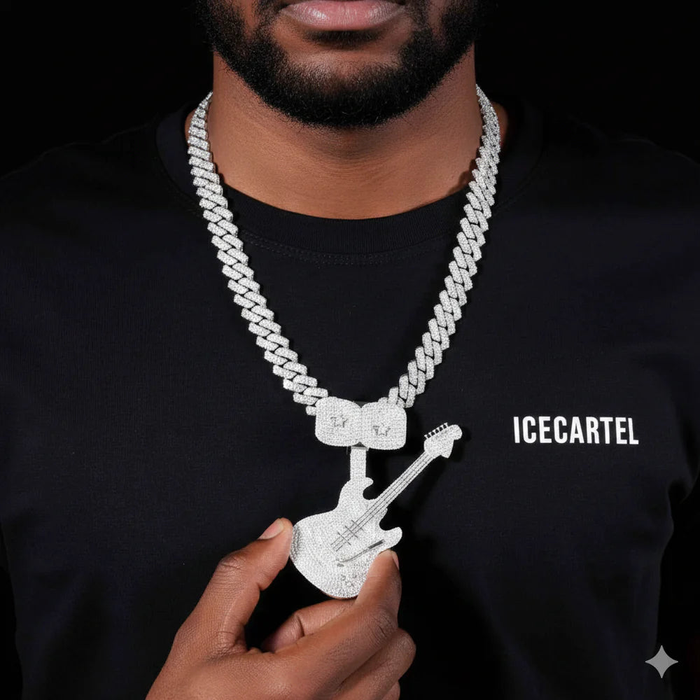 IceCartel™ exclusive "GUITAR" Custom Moissanite Pendant 14K Gold is now available, made with a base of 925 sterling silver and PVD plated with a thick layer of 14K Gold.
