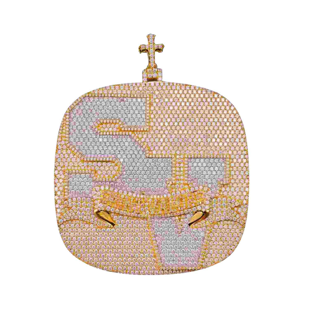 This custom pendant is iced out withย VVS moissanite flawless diamonds. All of the diamonds on this custom pendant passes the diamond tester.